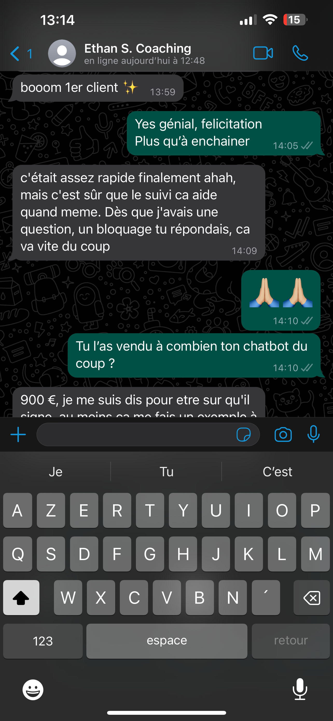 Réfléchis : un seul contrat de chatbot à 1500€ et tu as déjà rentabilisé la formation, avec 503€ de bénéfice. Dans ce domaine, 997€ se récupèrent très vite. De plus, cette formation te servira pour tous tes futurs clients, c'est un investissement sur le long terme.